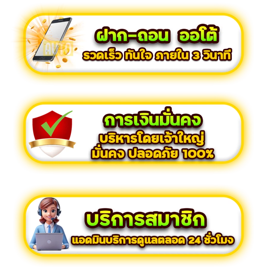 ตอบ : มีระบบฝาก-ถอนอัตโนมัติ 24 ชั่วโมง รองรับธนาคารหลักทุกธนาคาร มีเกมพนันให้เลือกหลากหลาย และมีโปรโมชั่นแรกเข้า 100%